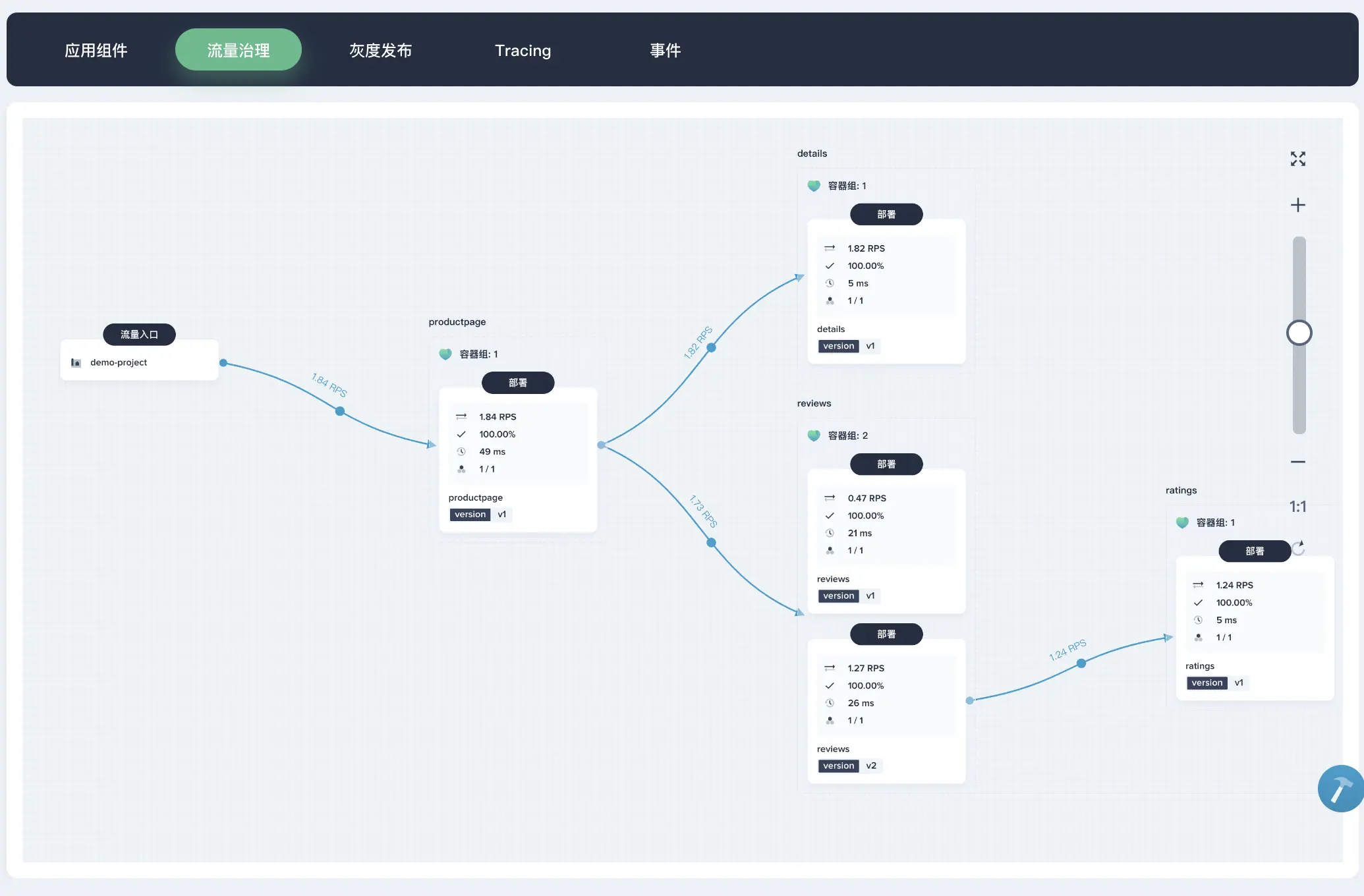 从流量治理的链路图中,可以看到各个微服务之间的服务调用和依赖、健康状况、性能等情况。