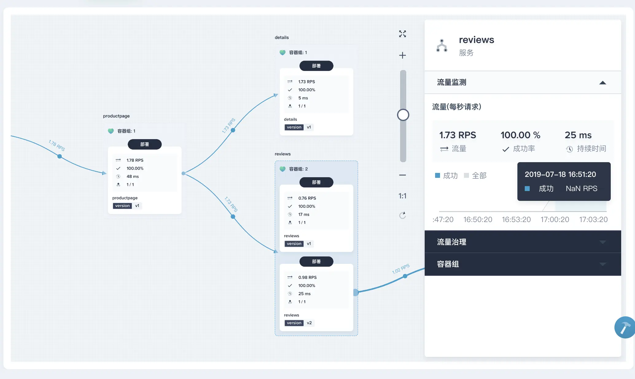 点击 reviews 服务,查看该服务的实时流量监测,包括每秒请求的流量 (RPS)、成功率、持续时间等指标,这类指标都可以分析该服务的健康状况和请求成功率。