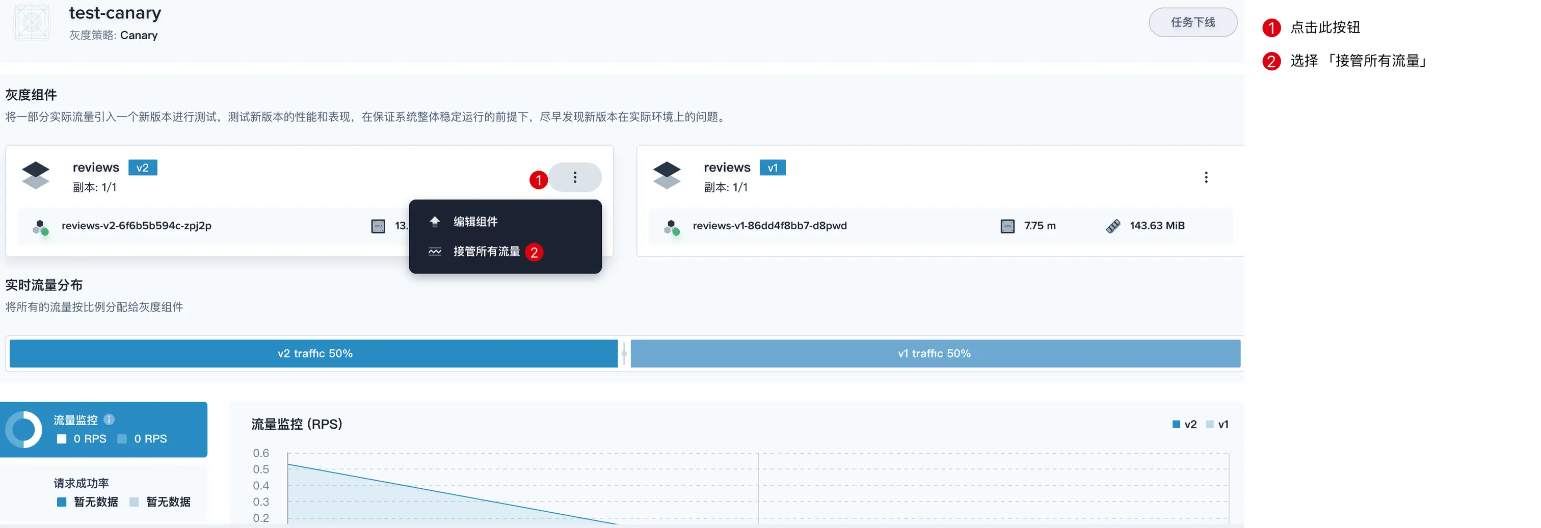 提示:此时 v1 也将保持在线,若 v2 上线后发现问题,允许发布者随时将新版本 v2 的流量切回 v1。