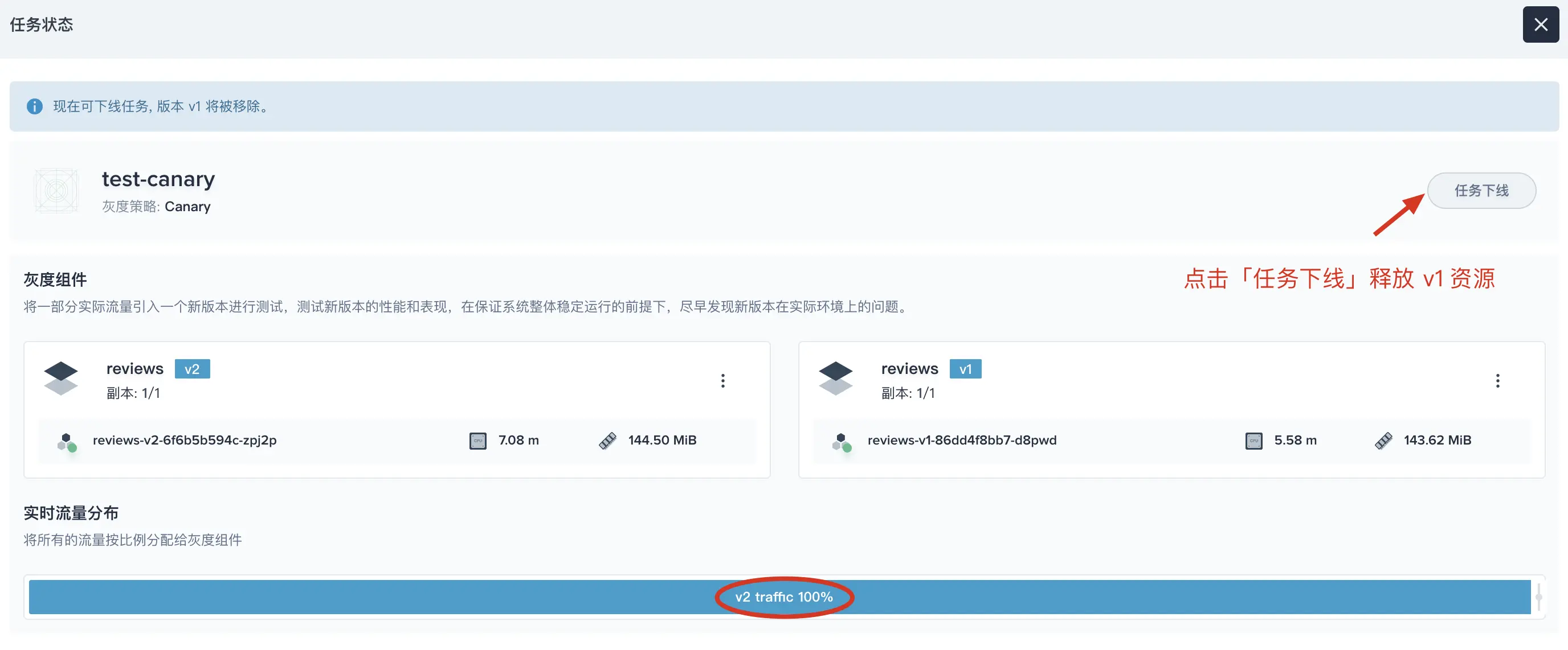 当新版本 v2 上线接管所有流量后,并且测试和线上用户反馈都确认无误,即可下线旧版本,释放资源 v1 的资源。下线应用组件的特定版本,会同时将关联的工作负载和 istio 相关配置资源等全部删除。