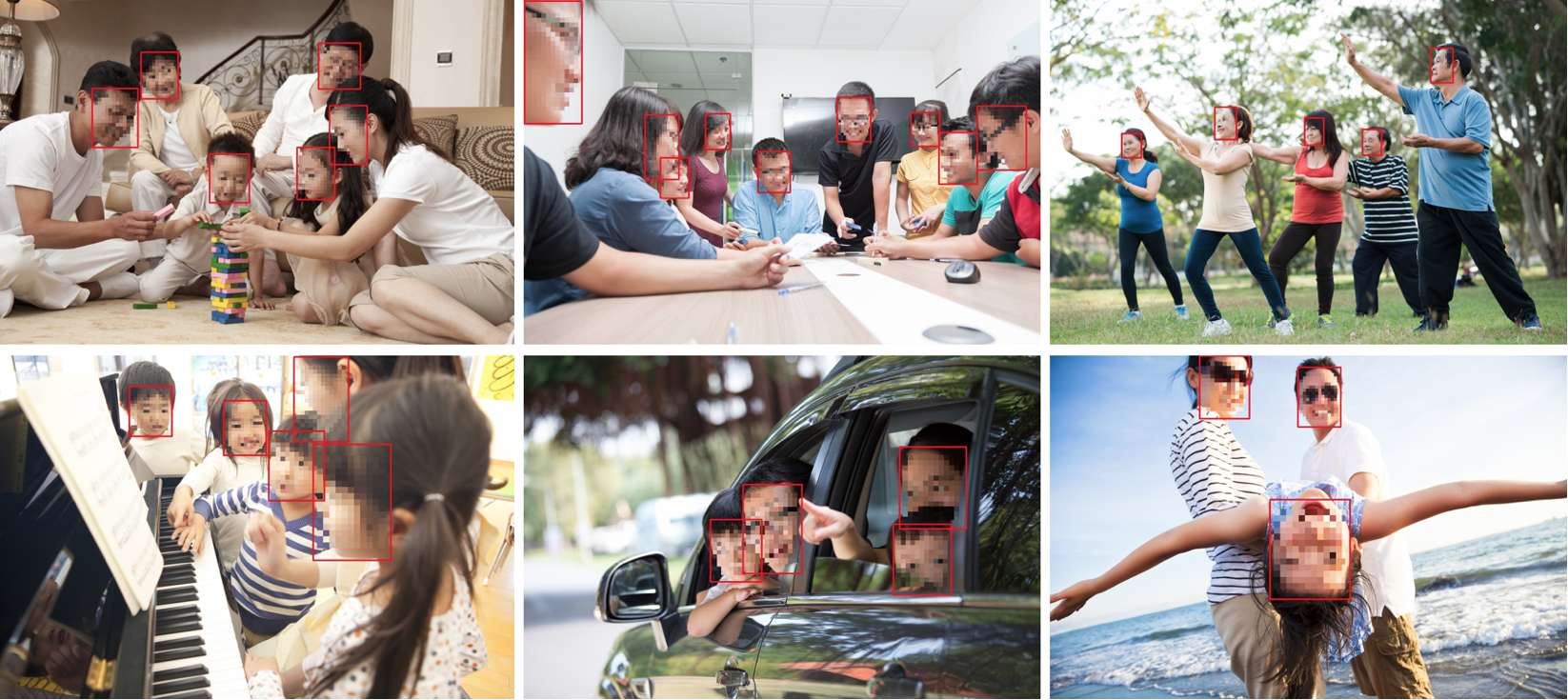 人脸检测技术是通过人工智能分析的方法自动返回图片中的人脸坐标位置和尺寸大小,是人脸智能分析应用的核心组成部分,具有广泛的学术研究价值和业务应用价值,比如人脸识别、人脸属性分析(年龄估计、性别识别、颜值打分和表情识别)、人脸Avatar、智能视频监控、人脸图像过滤、智能图像裁切、人脸AR游戏等等。因拍摄的场景不同,自然场景环境复杂多变,光照因素也不可控,人脸本身多姿态以及群体间的相互遮挡给检测任务带来了很大的挑战(如图1所示)。在过去20年里,该任务一直是学术界和产业界共同关注的热点。
