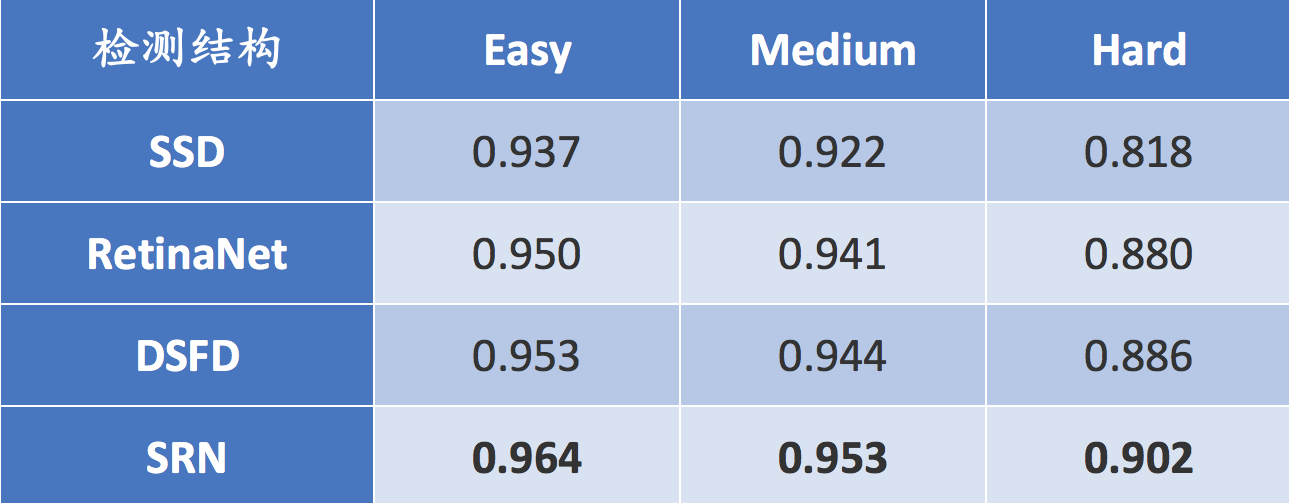 注:SRN是中科院在AAAI2019提出的新方法,DSFD是腾讯优图在CVPR2019提出的新方法,PyramidBox++是百度在2019年提出的新方法,AInnoFace是创新奇智在2019提出的新方法,RetinaFace是ICCV2019 Wider Challenge亚军。