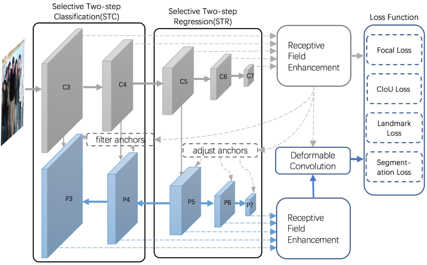 人脸检测的优化目标不仅需要区分正负样本(是否是人脸),还需要定位出人脸位置和尺寸。S3FD中区分正负样本使用交叉熵损失函数,定位人脸位置和尺寸使用Smooth L1 Loss,同时使用困难负样本挖掘解决正负样本数量不均衡的问题。另一种缓解正负样本不均衡带来的性能损失更直接的方式是Lin等人提出Focal Loss[13]。UnitBox[41]提出IoU Loss可以缓解不同尺度人脸的定位损失差异大导致的性能损失。AlnnoFace[40]同时使用Focal Loss和IoU Loss提升了人脸检测模型的性能。引入其它相关辅助任务也可以提升人脸检测算法的性能,RetinaFace[42]引入关键点定位任务,提升人脸检测算法的定位精度;DFS[43]引入人脸分割任务,提升了特征的表示能力。