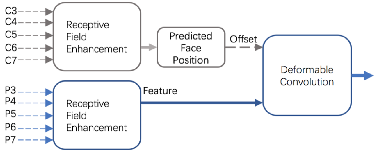 在VICFace中,将带孔洞的卷积模块和1xk,kx1的卷积模块联合作为Context Module,既提升了感受野的范围也有助于检测极端姿势的人脸,同时使用Maxout模块提升召回率,降低误检率。它还利用Cn层特征预测的人脸位置,校准Pn层特征对应的区域,如图5所示。Cn层预测的人脸位置相对特征位置的偏移作为可变卷积的Offset输入,Pn层特征作为可变卷积的Data输入,经过可变卷积后特征对应的区域与人脸区域对应更好,相对更具有表示能力,可以提升人脸检测模型的性能。