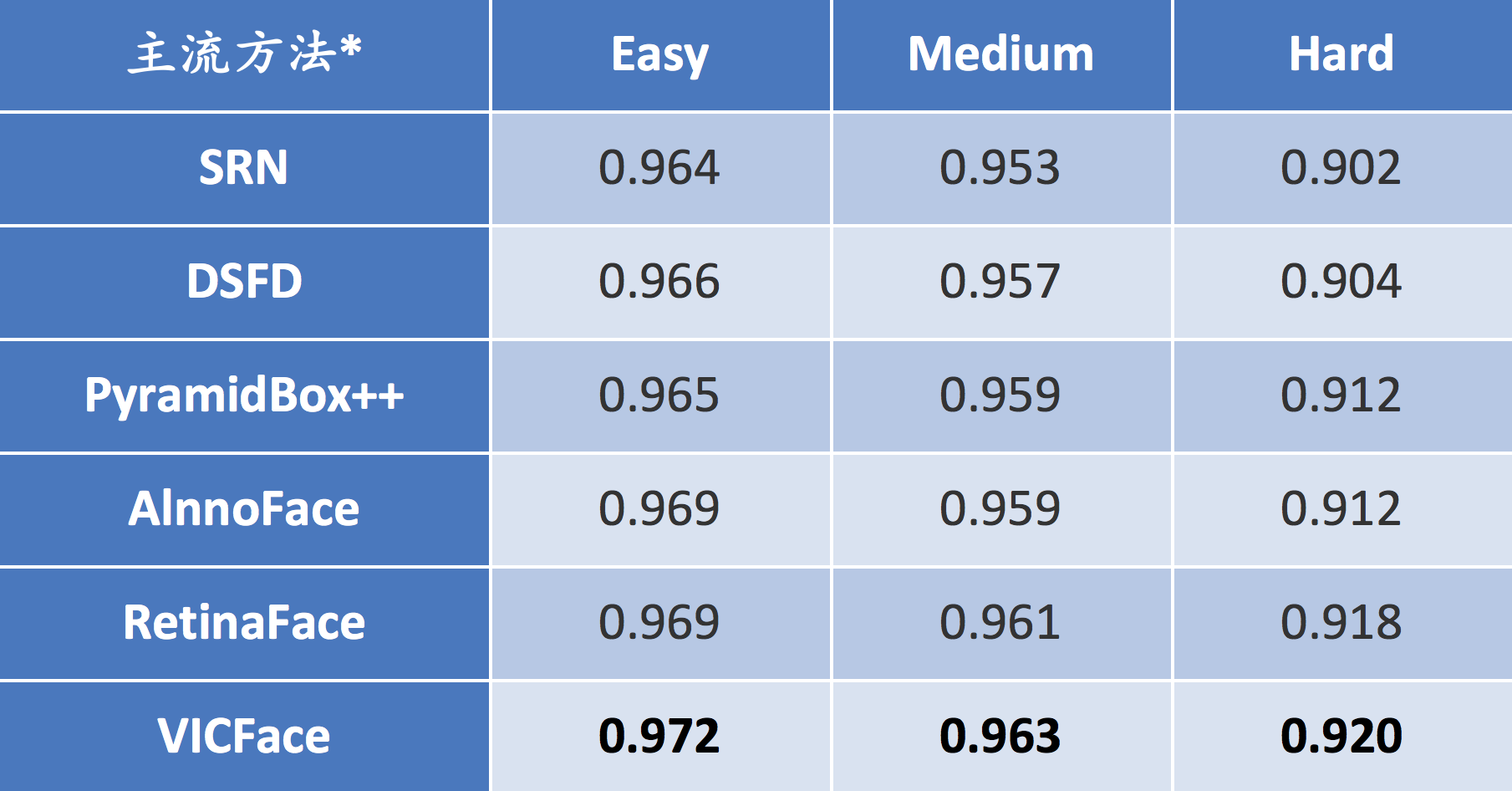 图6 VICFace以及当前主流人脸检测方法在WIDER FACE上的测评结果