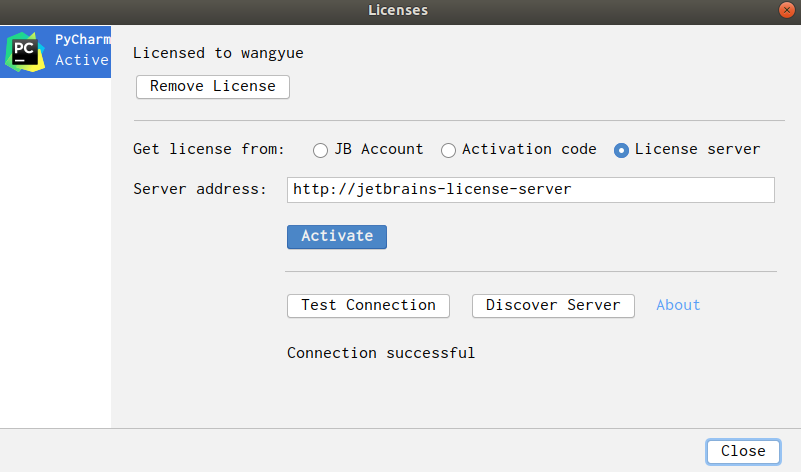 再次打开pycharm 选择 help -> Register -> license server 会自动补全 address, 选择 test connection 会显 Connection successful 如果不成功需要重新更换补丁文件。 继续点击ACTIVATE ,完成激活 。