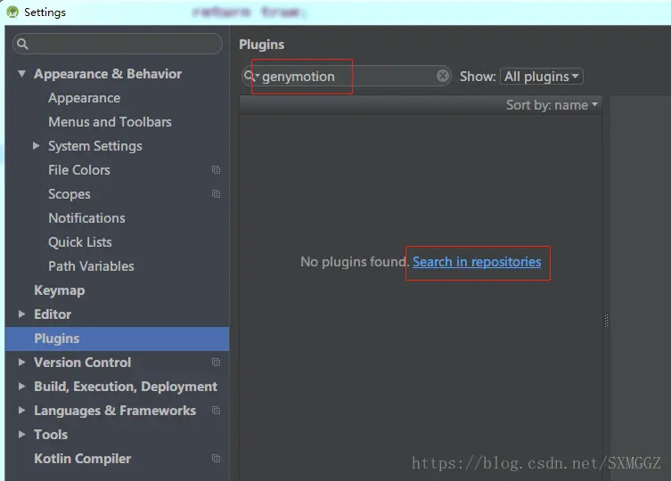 4.在AS中打开设置(Ctrl+Alt+S),找到Plugins选项并点击,在搜索栏输入genymotion,然后点击Search in repositories在线搜索