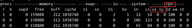 r b swpd free buff cache si so bi bo in cs us sy id wa st