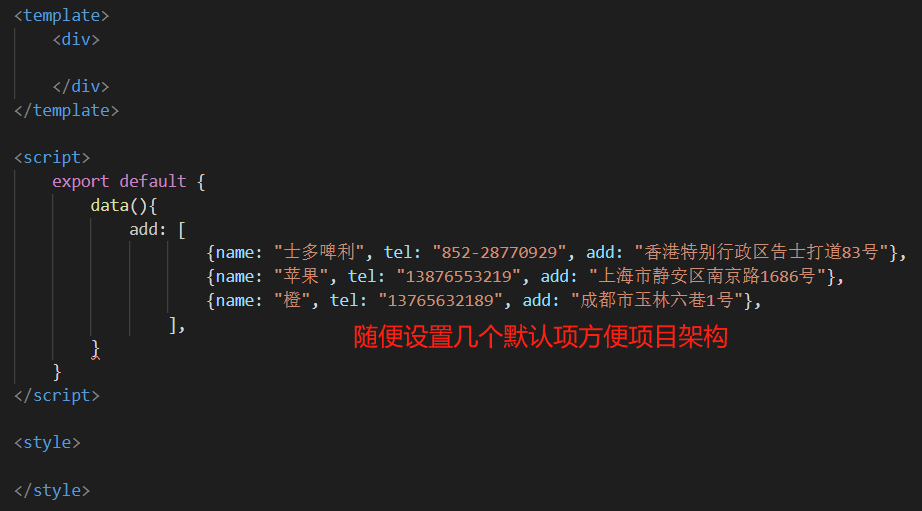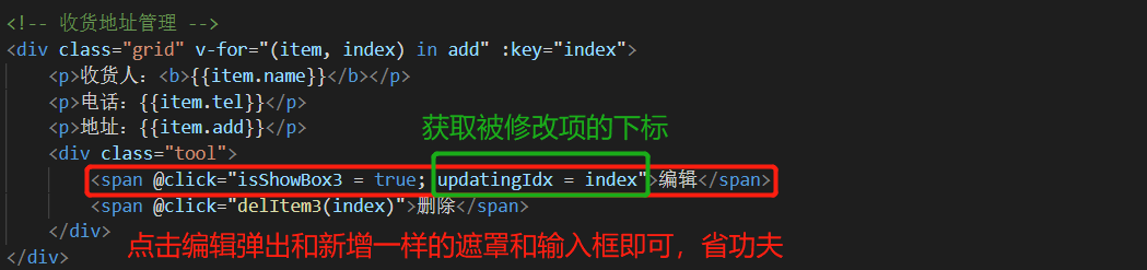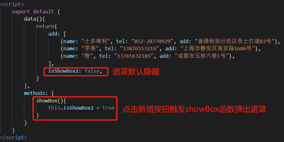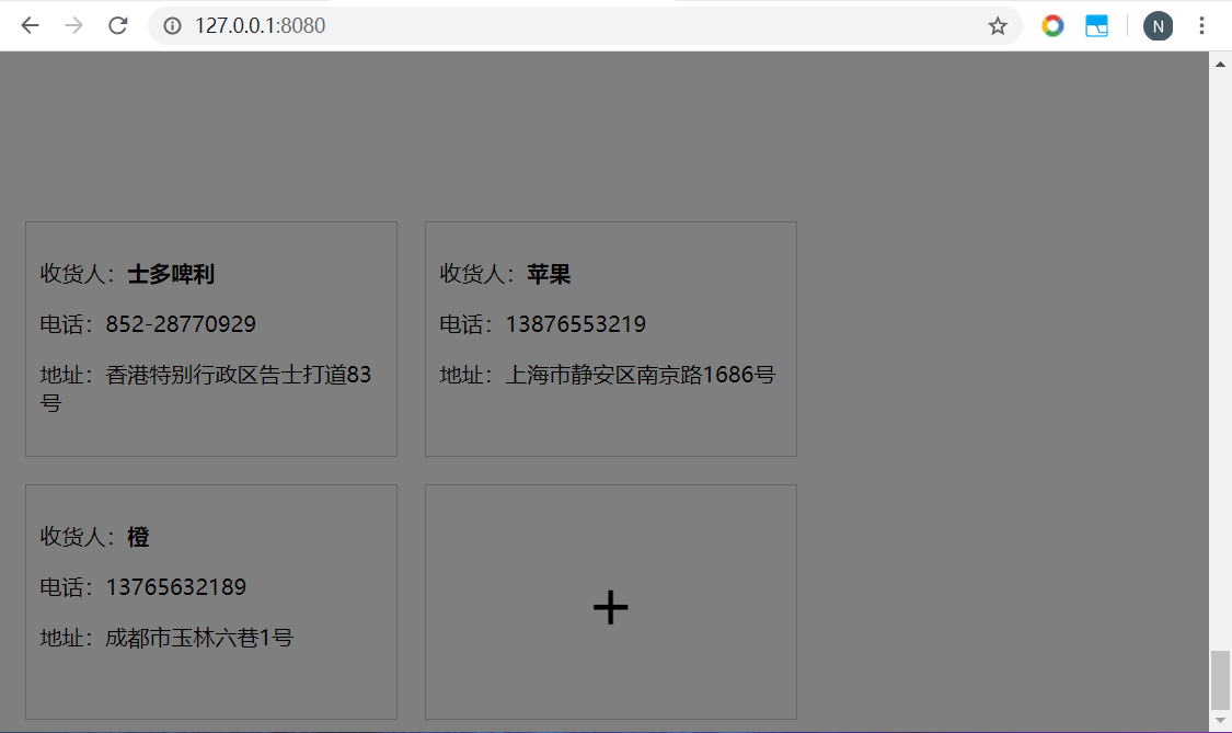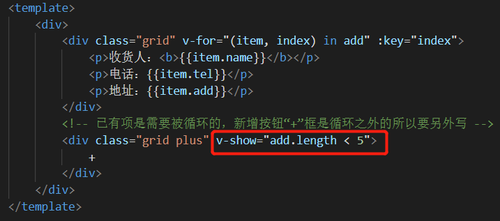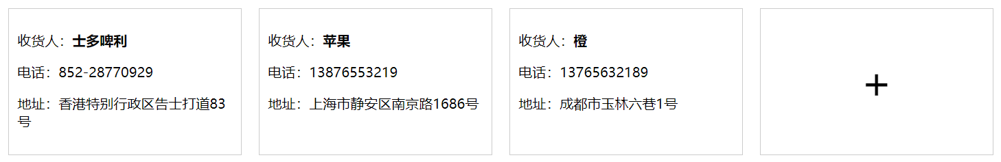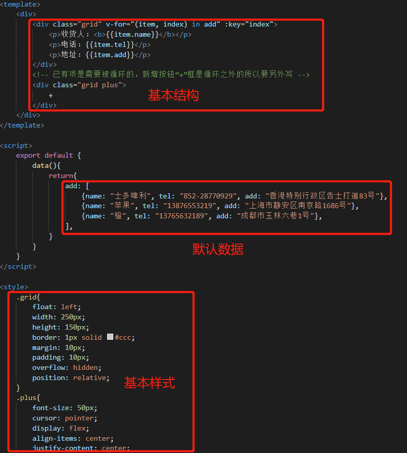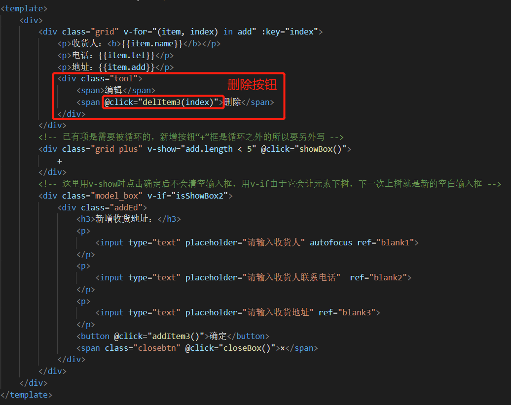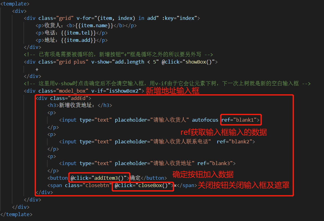 Vue指令综合实践 - 收货地址管理 乌龙白桃Nina酱 2020-02-07 1,502 阅读1分钟 先在data中设置几个默认项来方便整个项目的架构: 有了默认项作参考更有利于结构层和样式层的排布: 基本结构和基本样式排布好之后项目就能立体呈现,后面要做的就进一步搭建功能以及优化: 优化1,新增按钮在地址总数达到一定数量后消失以抑制用户不断新增数据,这里由于不涉及子组件生命周期以及元素的上下树问题,直接用v-show通过判断条件来控制新增按钮是否显示,比如地址总数最多5个: 优化2,点击新增按钮弹出遮罩及新增地址输入框: 优化3,给每个地址添加“编辑”和“删除”按钮: