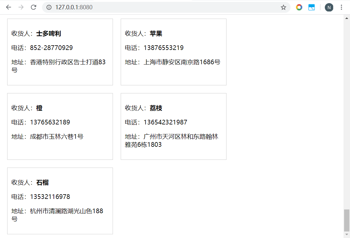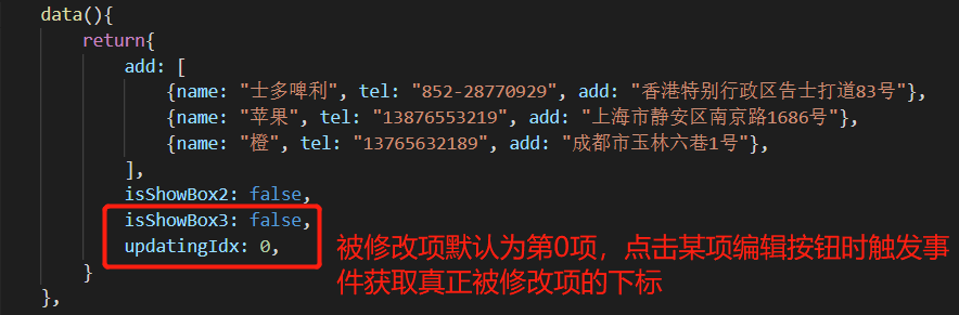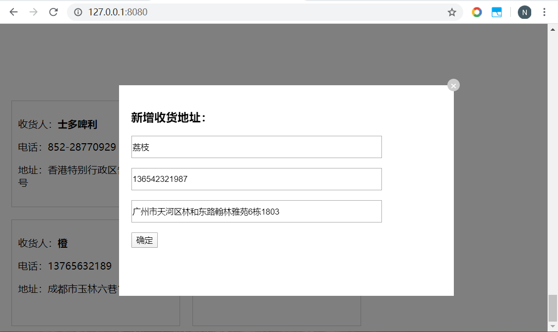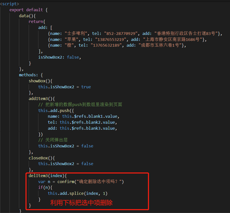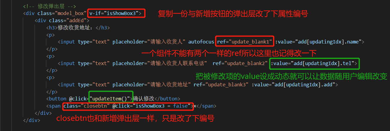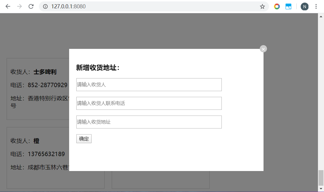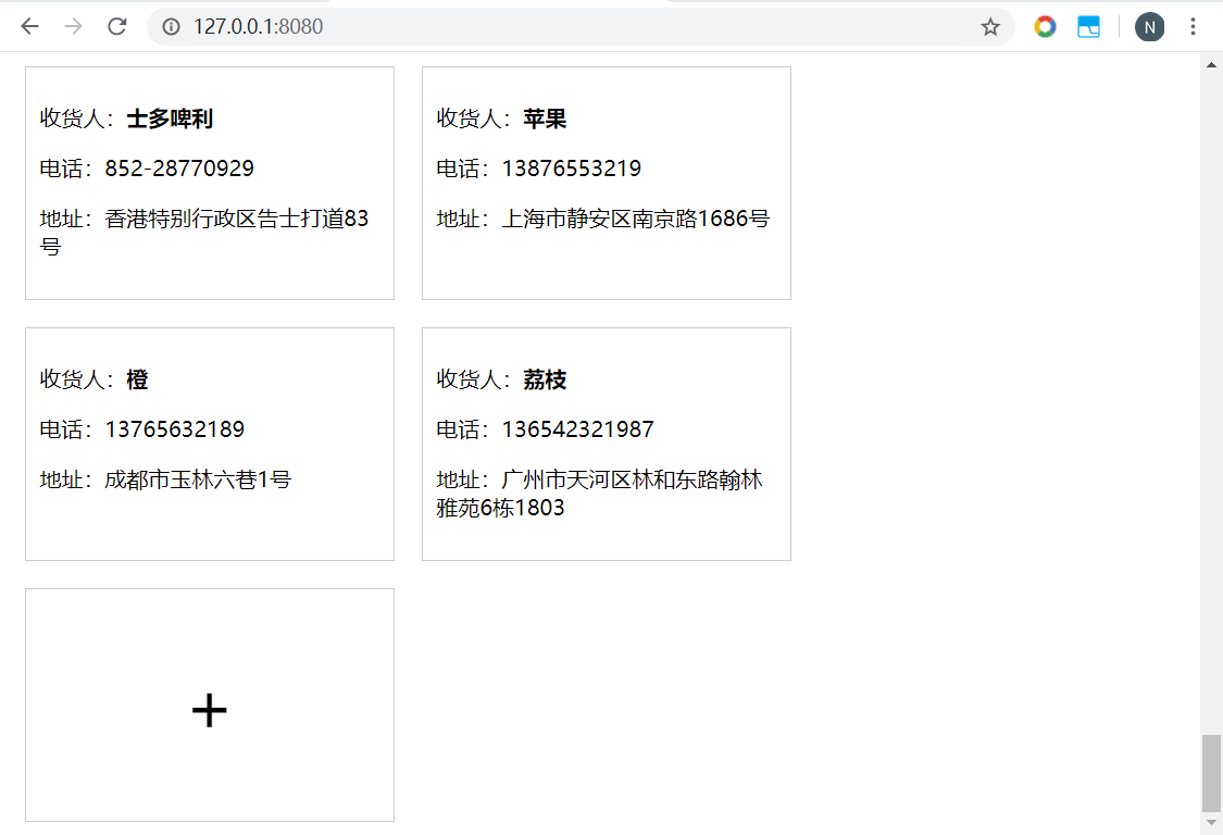 Vue指令综合实践 - 收货地址管理 乌龙白桃Nina酱 2020-02-07 1,502 阅读1分钟 先在data中设置几个默认项来方便整个项目的架构: 有了默认项作参考更有利于结构层和样式层的排布: 基本结构和基本样式排布好之后项目就能立体呈现,后面要做的就进一步搭建功能以及优化: 优化1,新增按钮在地址总数达到一定数量后消失以抑制用户不断新增数据,这里由于不涉及子组件生命周期以及元素的上下树问题,直接用v-show通过判断条件来控制新增按钮是否显示,比如地址总数最多5个: 优化2,点击新增按钮弹出遮罩及新增地址输入框: 优化3,给每个地址添加“编辑”和“删除”按钮: