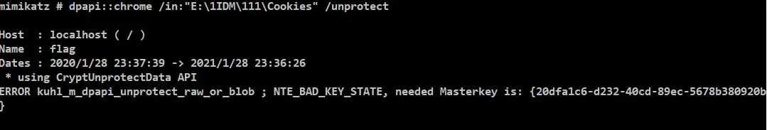 又经过了漫长的搜寻(对我这种人来说这就是个信息收集比赛...),终于找到了 mimikatz解Chrome的cookies的方法 www.bus123.net/11173.html 翻译得很烂,但是大致意思能懂,然后又找到了 www.anquanke.com/post/id/158… ,详细解释了各种方法和在其他电脑解密Cookies需要的前序条件和方法