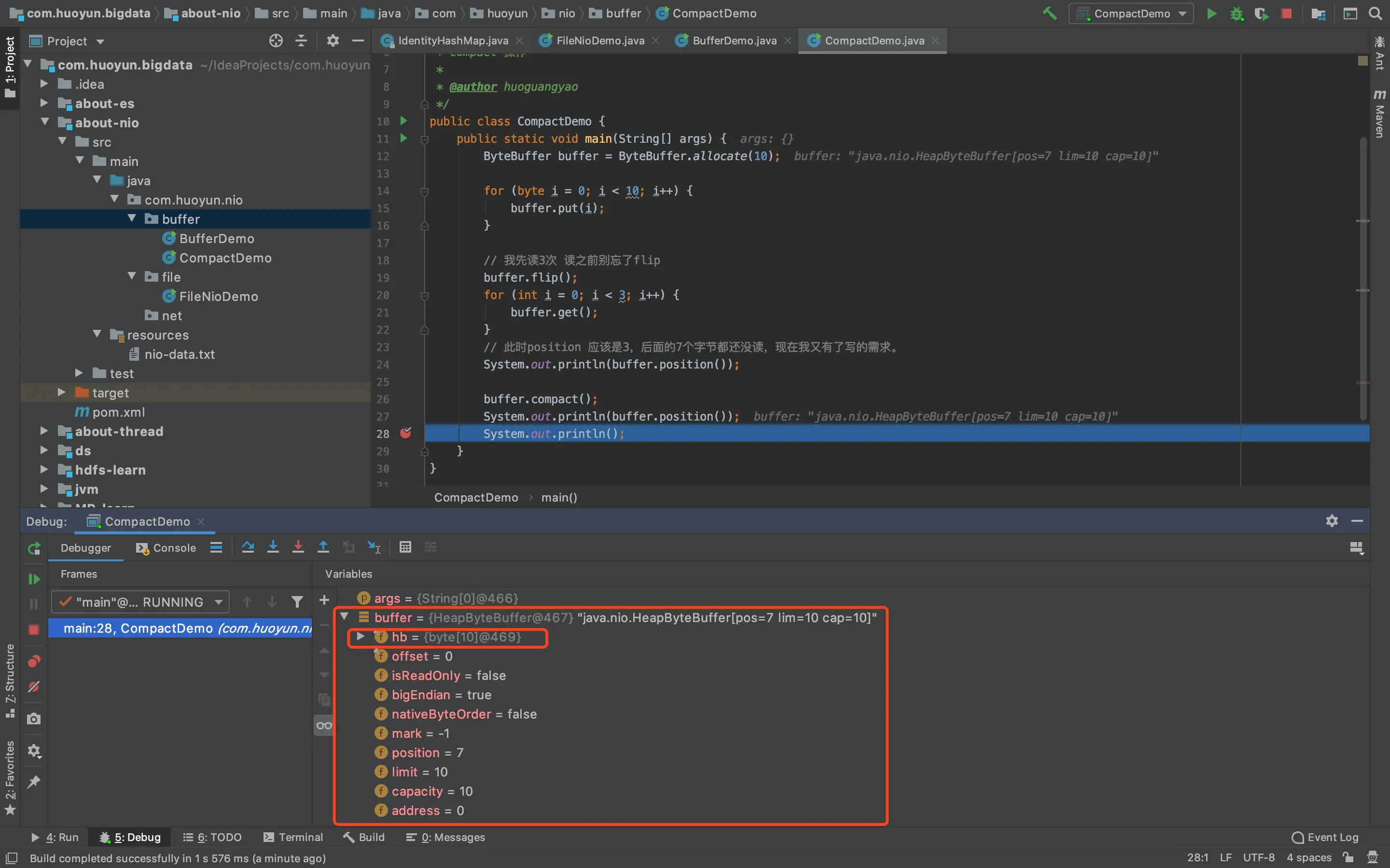 - 写一段java代码,打上断点,很容易观察到buffer怎么一回事儿。核心的三个概念很直观就能看到是多少。我这个代码演示的是