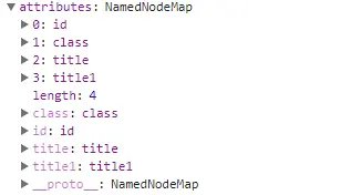 可以发现有一个名为“attributes”的属性,类型是NamedNodeMap,同时有“id”和“className”、”title“等基本的属性,但没有“titles”这个自定义的属性。