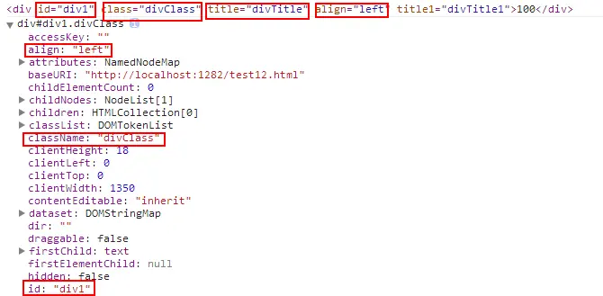<div id="div1" class="divClass" title="divTitle" align="left" title1="divTitle1"></div>