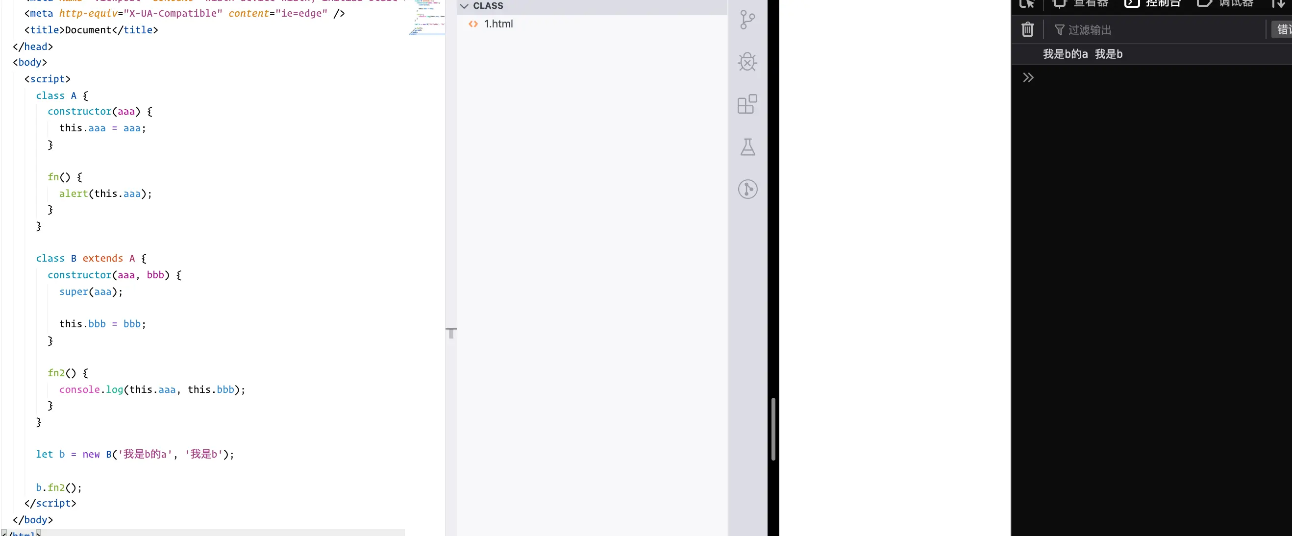 现在咱们的类是一个函数,是函数就能执行,咱们只需要把A拿过来执行一下并且call到自己身上,再把A需要的参数传过去,这样就能拿到所有的参数了,像这样
