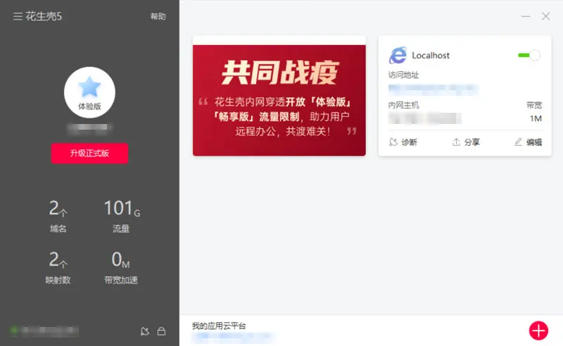 由于我们是本地开发,所以需要在正式前利用 花生壳 工具将本地 ip 暴露到公网,工具将分配给我们一个与该 ip 绑定的域名,之后将提交给 微信公众平台测试账号 。这里要注意的是 花生壳内网穿透生成的域名由于被微信屏蔽,所以无法在正式发布时使用!!!