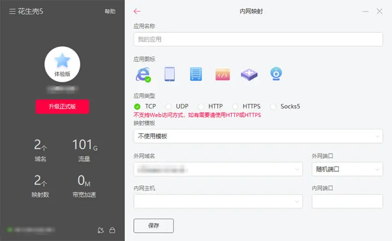点击右下角加号,外网域名为花生壳提供给我们的公网域名,内网主机填写本机 ip ,端口填写开发设置的端口即可。可以通过访问该对公域名(或点击诊断图标)测试配置是否成功。