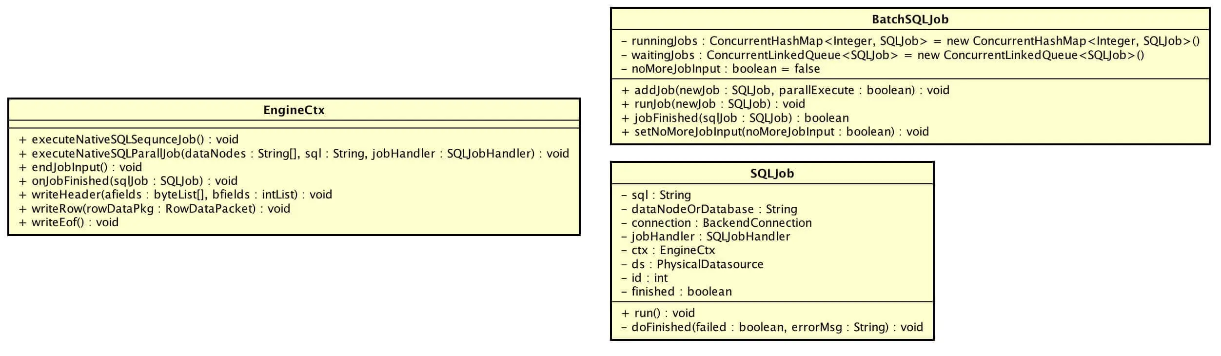 #fieldEofResponse(...):接收数据节点返回的 fields,放入内存。#rowResponse(...):接收数据节点返回的 row,放入内存。#rowEofResponse(...):接收完一个数据节点返回所有的 row。当所有数据节点都完成 SQL 执行时,提交右边的表执行的 SQL 任务,并行执行,即图中**#createQryJob(...)**。