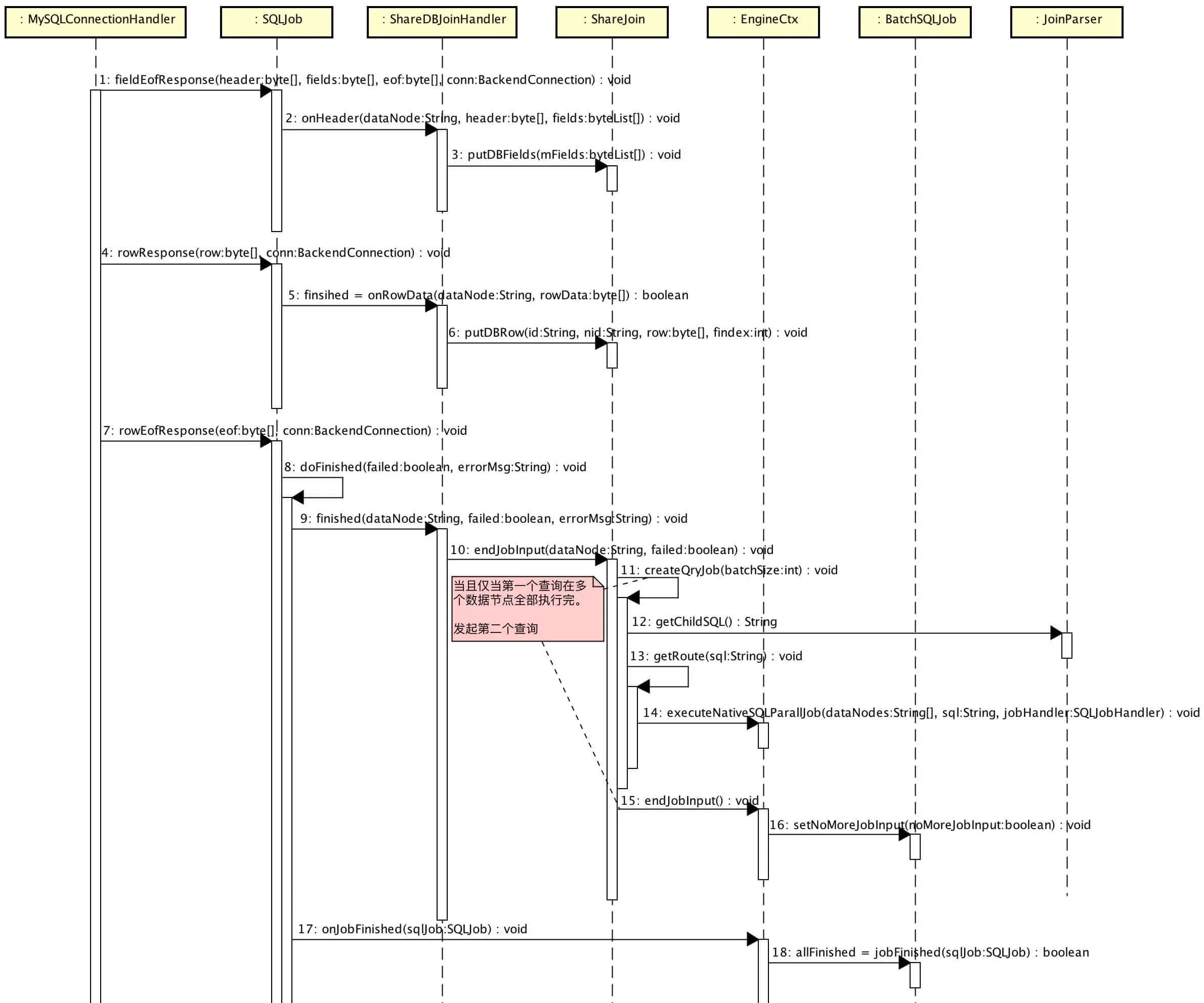 #fieldEofResponse(...):接收数据节点返回的 fields,返回 header 给 MySQL Client。#rowResponse(...):接收数据节点返回的 row,匹配左表的记录,返回合并后返回的 row 给 MySQL Client。#rowEofResponse(...):当所有 row 都返回完后,返回 eof 给 MySQL Client。