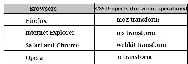 为了在进行Selenium自动化测试时放大或缩小,应使用transformCSS属性(适用于相应的浏览器),该属性可让您在页面上执行放大,缩小,旋转,倾斜等操作。不同类型的浏览器的CSS参数如下