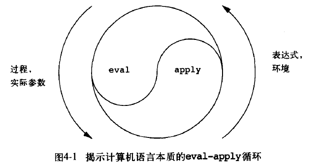 其中eval是evaluate的缩写,结合环境来计算表达式的值,而apply则是实际参数应用于过程,过程里面则存在新的环境和表达式。两个函数相互依赖,相互调用:只有表达式,则没有办法构造复杂程序;只有过程,则没有办法进行任何运算。下图展示了两个函数之间的关系,像极了中国的太极图。