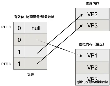 当 有效位 未被设置,如果该虚拟页已分配,则此时 地址 指向其虚拟页在磁盘中的起始位置,否则地址为 null。