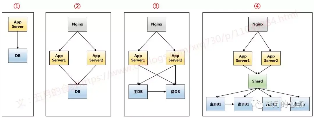 阶段四:企业发展越来越好了,业务越来越大了,做了读写分离数据库压力还是越来越大,这时候怎么办呢,一台数据库扛不住,那我们就分几台吧,做分库分表,对表做垂直拆分,对库做水平拆分。以扩数据库为例,扩出两台数据库,以一定的单号(例如交易单号),以一定的规则(例如取模),交易单号对2取模为0的丢到数据库1去,交易单号对2取模为1的丢到数据库2去,通过这样的方式将写数据库的流量均分到两台数据库上。一般分库分表会使用Shard的方式,通过一个中间件,便于连接管理、数据监控且客户端无需感知数据库ip