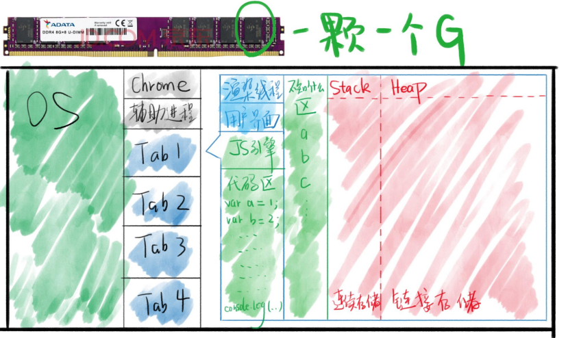 ⑤细看其中一个标签页的进程,他占据的内存被细分为渲染引擎线程、用户界面线程、JS引擎线程等。而JS引擎线程占据的内存又被细分为代码区、不知什么区、数据区等等