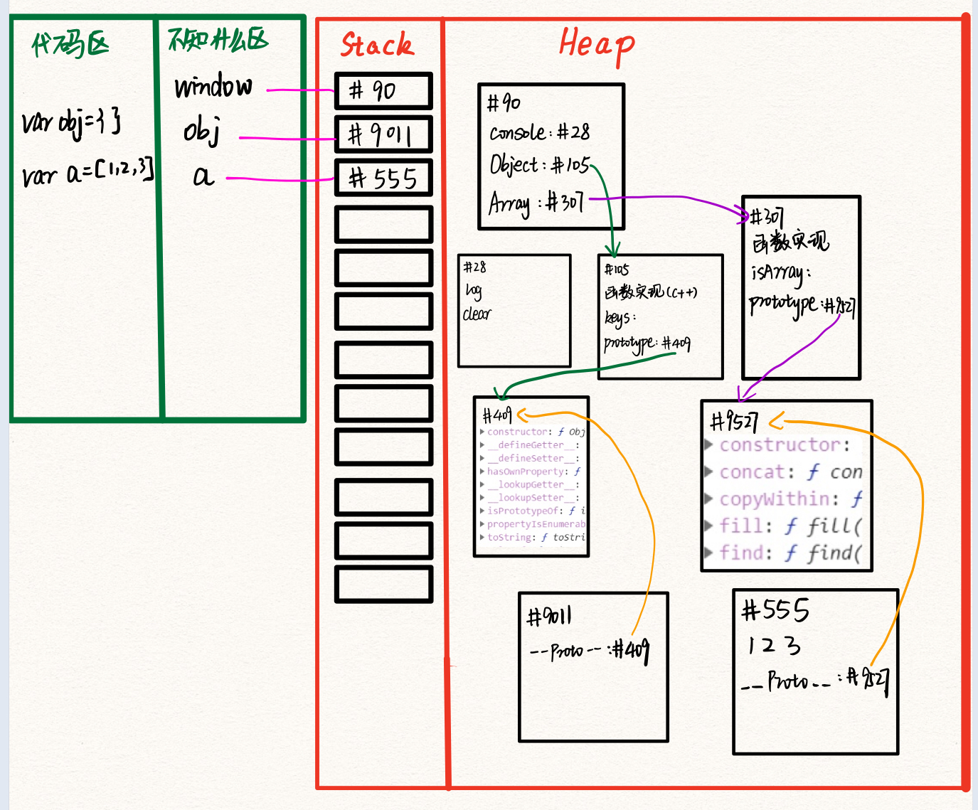 Heap堆中存放对象(如数组、函数),每个数据随机存放。这样就可以随时继续为对象添加数据了。