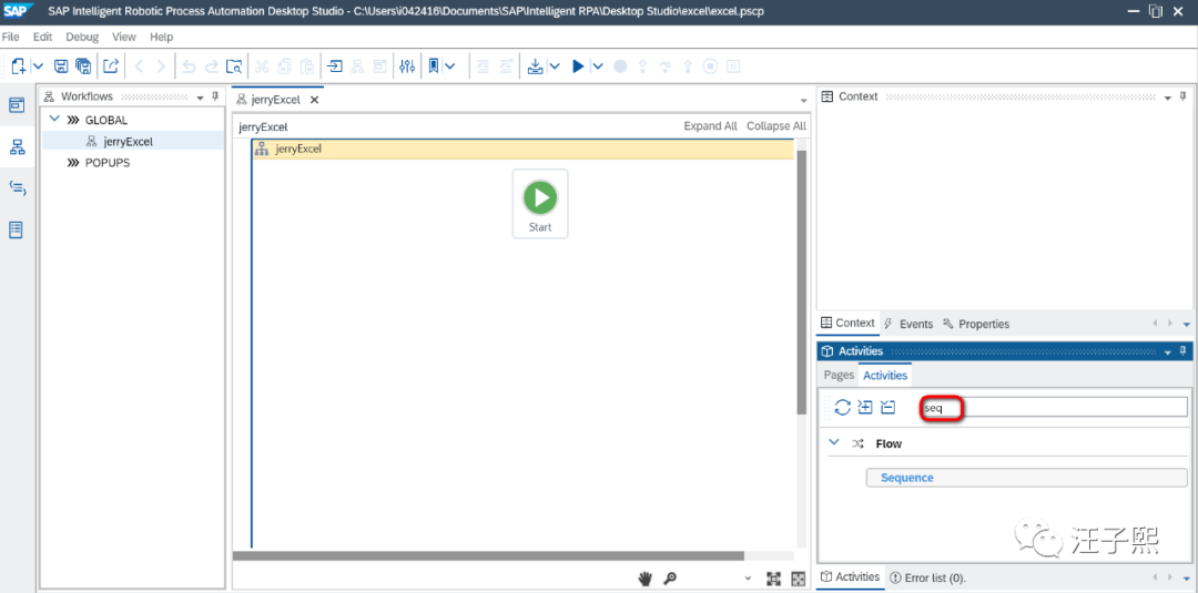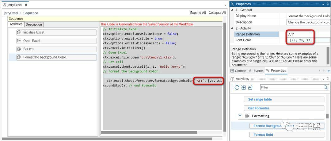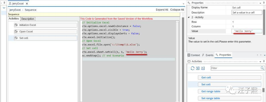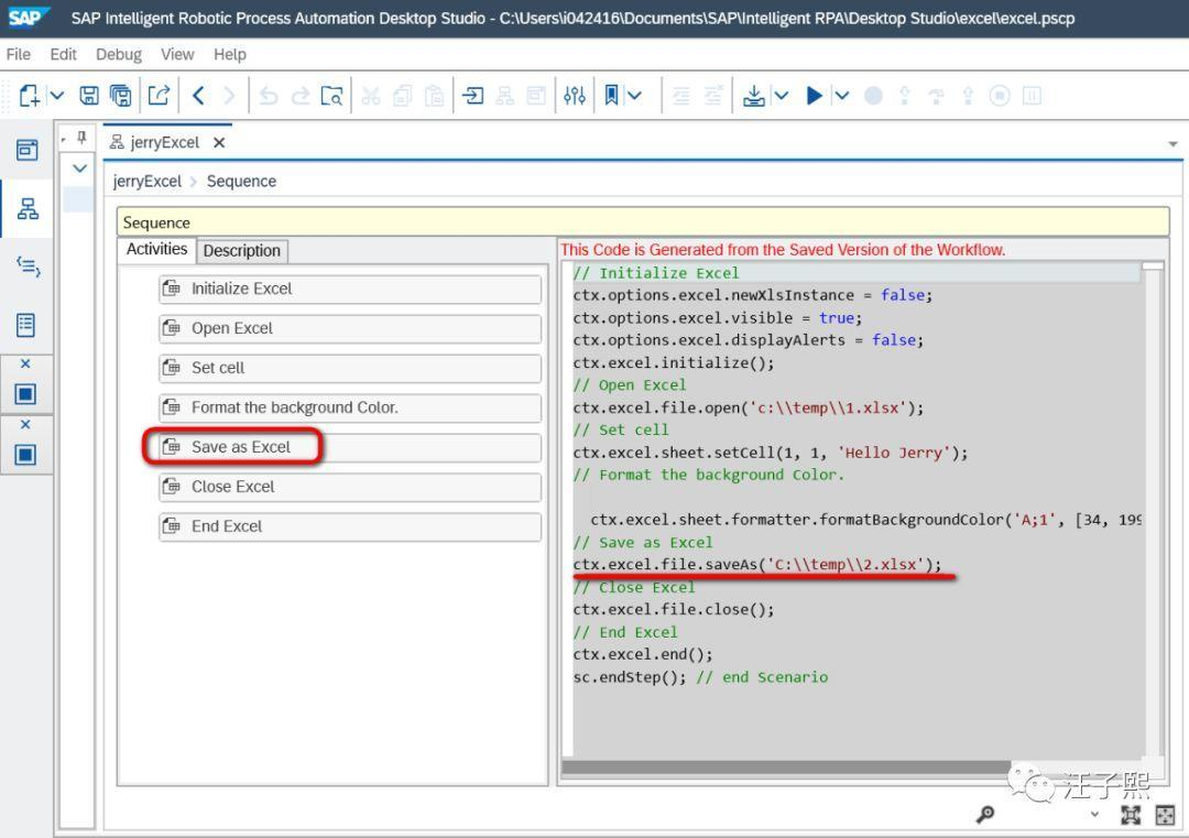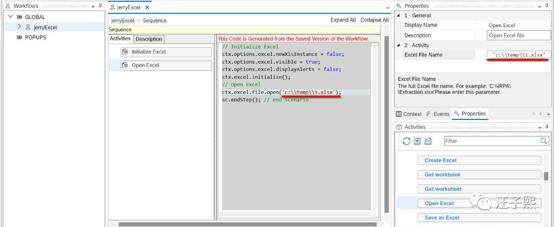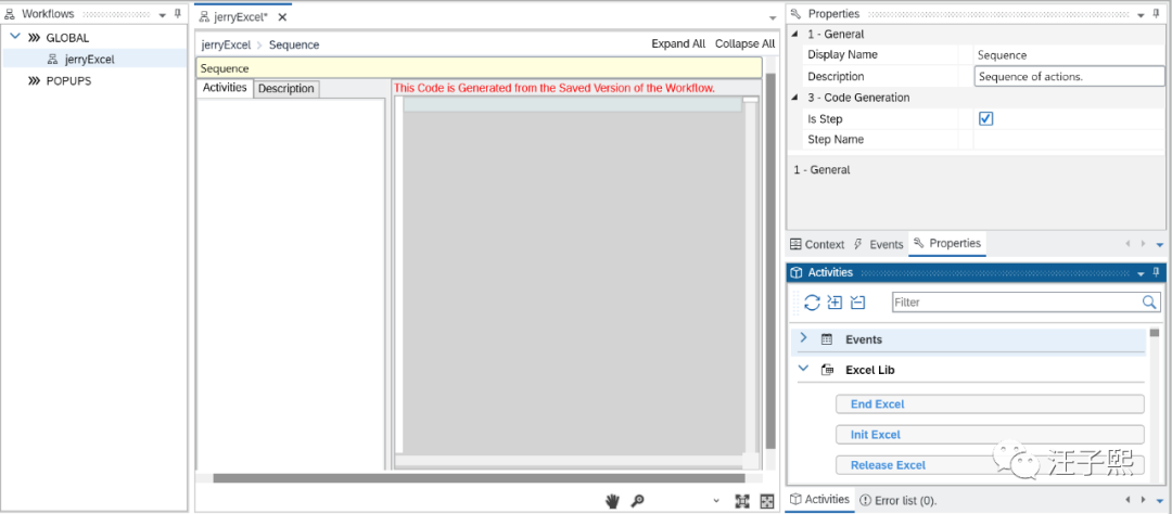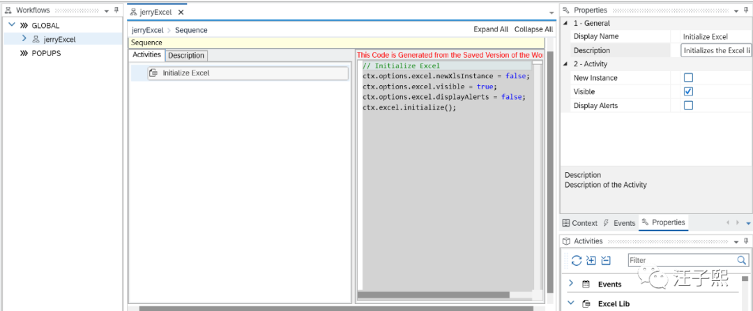比如把Init Excel拖拽到Sequence控件的Activities列表里之后,一旦保存,会立即看到自动生成的nodejs代码。Excel Lib里每个step,都对应一段nodejs代码。如此一来,即使SAP Intelligent Robotic Process Automation Desktop Studio的使用者没有编程基础,也能开发出能操作Excel的自动化工作流。