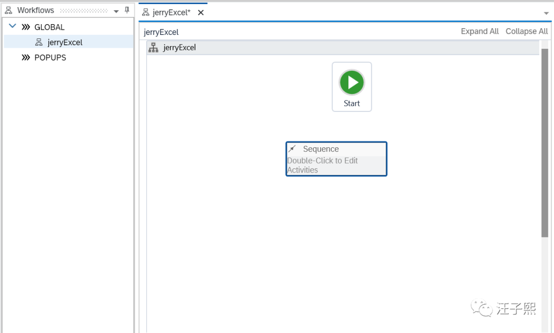 新建一个名叫jerryExcel的workflow,在工作流的activities面板里输入seq,找到类型为Sequence的Flow控件。该控件允许我们在工作流里定义一系列顺序执行的步骤。
