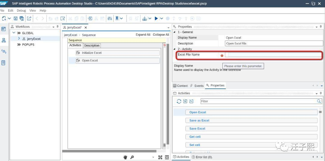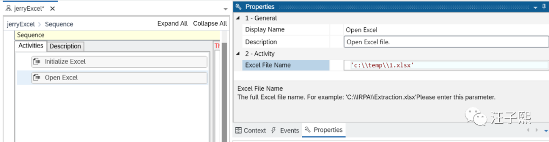 上图的Init Excel步骤是所有操作Excel的工作流都必须执行的一个初始化步骤。初始化完毕后,把Open Excel这个步骤拖拽到Sequence Activities里,指定要打开的Excel文件路径,在Desktop Studio里有红色提示。