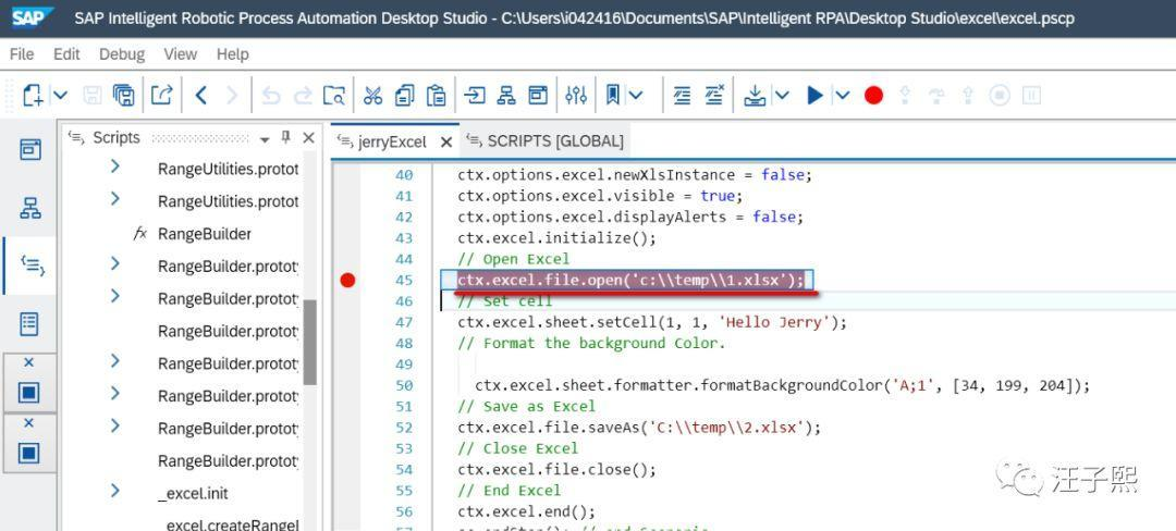 切换到Script面板,在第45行打开Excel的代码处设置断点,然后单步调试: