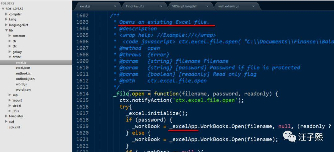 如果非要刨根究底,可以到SAP iRPA SDK安装目录下,打开excel.js文件,找到open方法的实现,发现其调用了_excelApp对象的WorkBooks.Open方法: