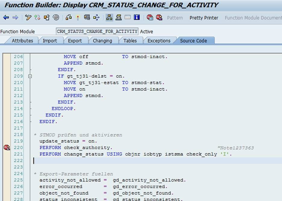 If the respective user status is configured with an authorization code, in the runtime, authorization check will be executed accordingly. But in CRM, there are two different use cases. (1) If end changes the user status directly in Fiori UI (edit page), authorization object “B_USERSTAT” will be used for check.