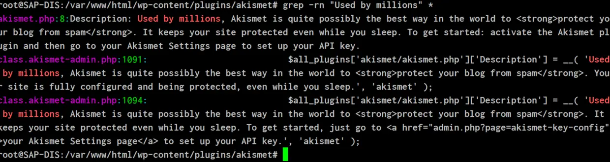 wordpress插件在服务器上的存储位置 已注销 2020-02-08 127 阅读1分钟 比如我有Akismet Anti-Spam这个插件: 其服务器端存储位置:/var/www/html/wp-content/plugins/akismet: 而在Wordpress PHP管理页面看到的文本,均来自该插件目录内的*-admin.php文件里 要获取更多Jerry的原创文章,请关注公众号"汪子熙":