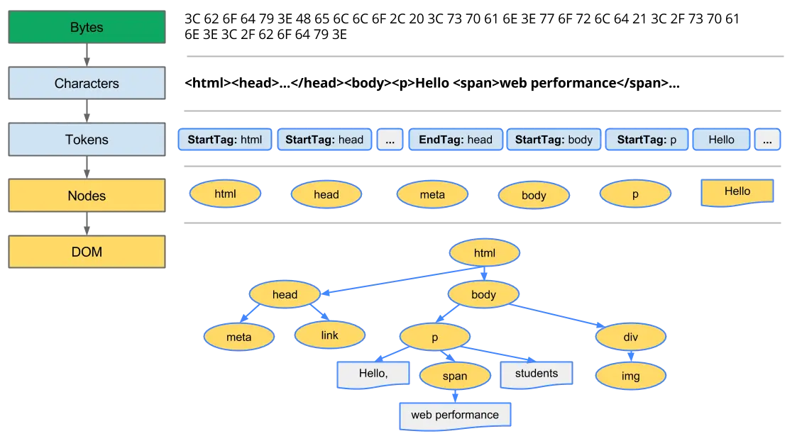 - 浏览器渲染页面前需要先构建 DOM 和 CSSOM 树。HTML 标记转换成文档对象模型 (DOM);CSS 标记转换成 CSS 对象模型 (CSSOM)。DOM 和 CSSOM 是独立的数据结构。