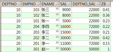 select deptno,sum(sal) over(partition by deptno)from t_emp Order by 11.求每个人工资占该员工所在部门总工资的比例