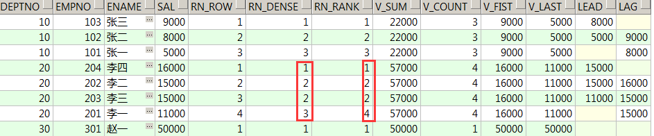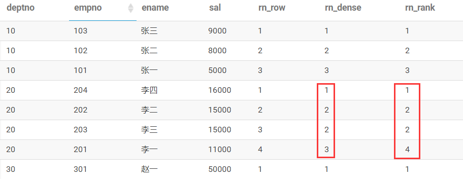 dense_rank() over(partition by deptno order by sal desc) rn_dense,