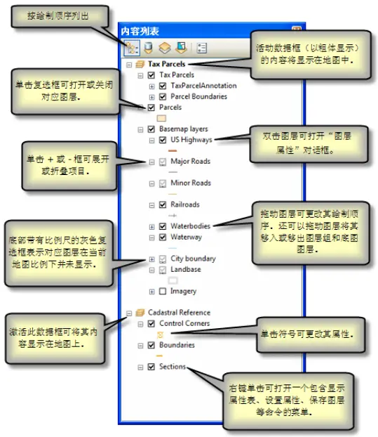 (1)按照绘图顺序列出,图层的显示将会按照图层加载的顺序依次显示所有图层地理要素的类型和表示方法。