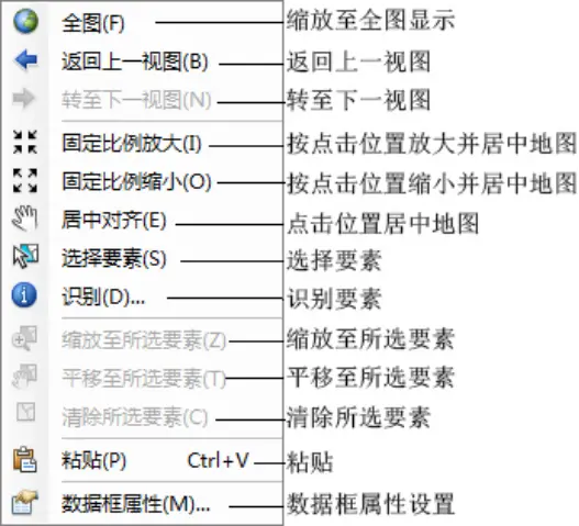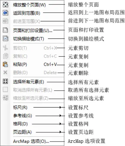 在ArcGIS不同位置单击右键会弹出不同的菜单,常用的弹出菜单包括:数据框弹出菜单、图层弹出菜单、数据视图弹出菜单、布局视图弹出菜单等。