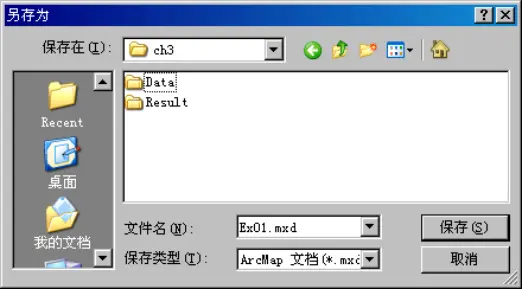 (5)点击标准工具条上的【保存】保存地图文档,保存位置“\ch3\”目录下,名称“Ex01.mxd”。