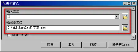 (7)在右侧【目录窗口】中,定位到【工具箱】—>【系统工具箱】—>【Data Management Tools】—>【要素】—>【要素转点】,打开要素转点对话框,输入要素:“县”图层,输出要素类:“\ch3\Result\县文本.shp”。