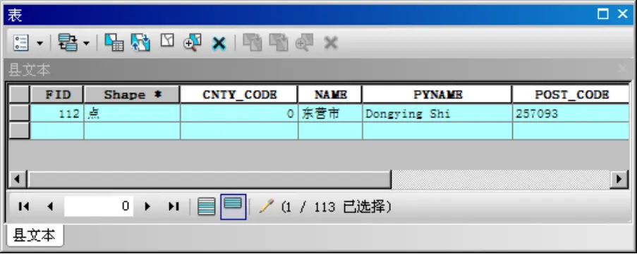 (12)新创建的点没有属性信息,需要添加。【内容列表】中在【县文本】图层上右键单击选择【打开属性表】,打开表窗口。选择【表】窗口底部的【显示所选记录】,只显示刚才创建的点。NAME值为“东营市”,PYNAME值为“Dongying Shi”,POST_CODE值为“257093”。