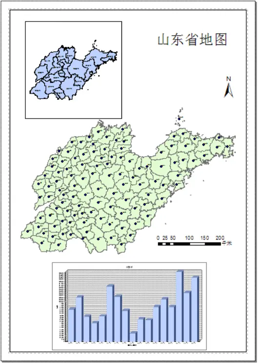 (23)最后添加图名、比例尺和指北针。在主菜单【插入】菜单项下分别选择【标题】、【指北针】、【比例尺】等。设置完成后的结果。