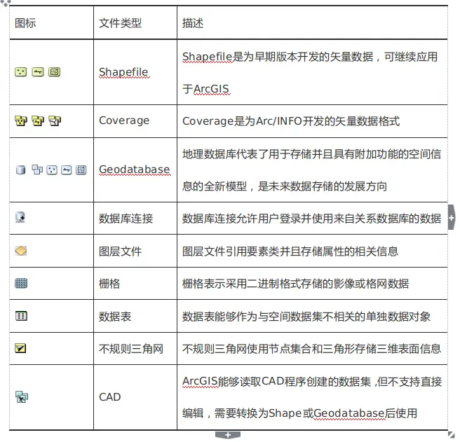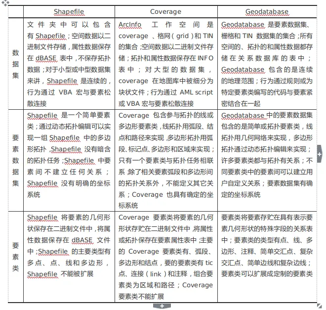 ArcGIS使用的三种主要地理数据集的类型分别为Shapefile、Coverage 和Geodatabase,其具体比较。