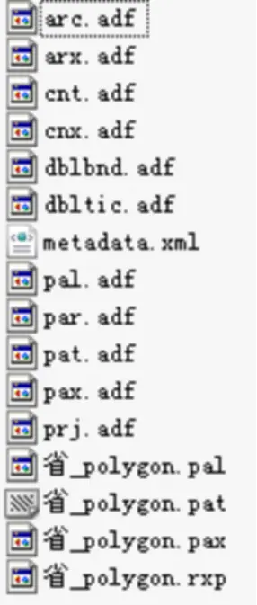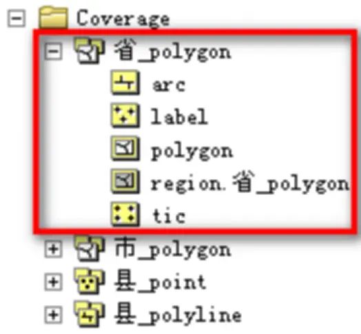 Coverage以目录形式存储,而目录中的每个要素类则以一组文件的形式进行存储。Coverage在ArcCatalog显示为黄色图标。