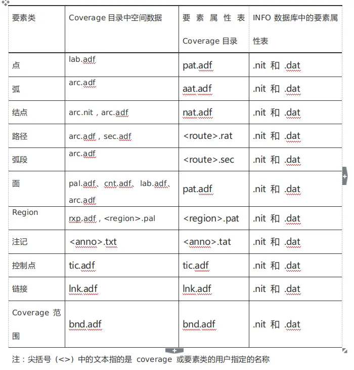 Coverage由一组文件组成,每个文件都包含有关特定要素类的信息。存储在 Coverage 中的文件组取决于 Coverage 中包含的要素类。每个 Coverage 工作空间都有一个 INFO 数据库,存储在子目录 info 下。Coverage 文件夹中的每个 .adf 文件都与 INFO 文件夹中的一对 .dat 和 .nit 文件关联。INFO 目录中的 arc.dir 文件用于追踪与 .adf 文件关联的那对 .nit 和 .dat 文件。