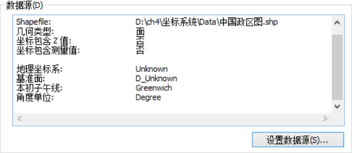 (1)在ArcMap中添加【连接到文件夹】至“ch4\坐标系统\Data”,加载“中国政区图.shp”。加载完成后在图层上右键单击选择【属性】,打开【属性对话框】,选择【源】选项卡,可以看到地图坐标是的经纬度形式(状态栏),地理坐标系中显示的未知坐标系。