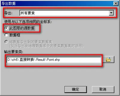 (3)在ArcMap内容列表中“CAD.dwg Point”图层上右键单击选择【数据】----【导出数据】,打开【导出数据】对话框。在【导出数据】对话框中设置如下:导出:“所有要素”,勾选“次图层的数据源”,输出要素类:“\ch6\直接转换\ Result\Point.shp”。如图所示。此种方式只能导出CAD数据中某一类的记录数据。